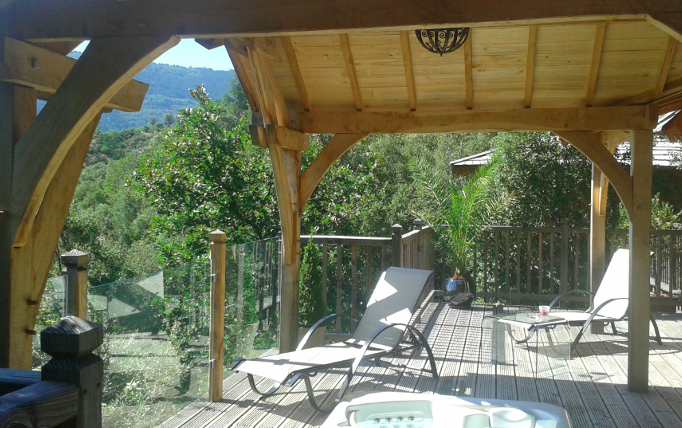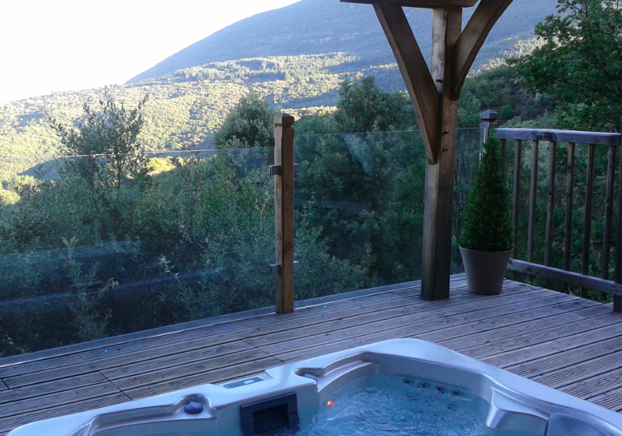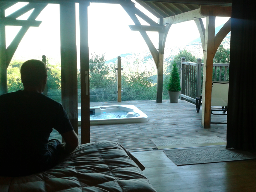 C'est là que tout se passe d'ailleurs, sur la terrasse puisque le jacuzzi y est installé, encastré au sol, juste là en sortant de la chambre avec une vue fabuleuse sur les Cévennes Gardoises, en pleine nature, dans les arbres, des chataigners, des chênes.